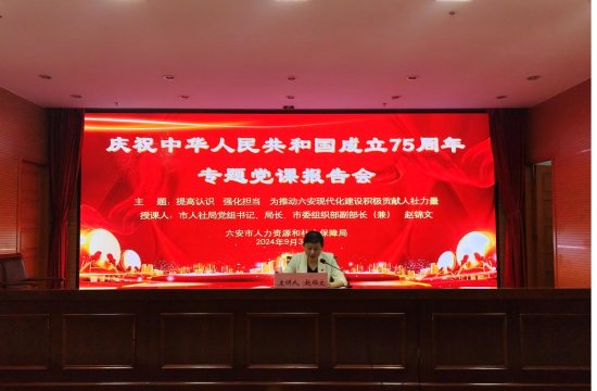 为庆祝中华人民共和国成立75周年,9月30日,市人社局组织召开专题党课报告会,市人社局党组书记、局长,市委组织部副部长(兼)赵锦文授课,全体党员干部职工参加。